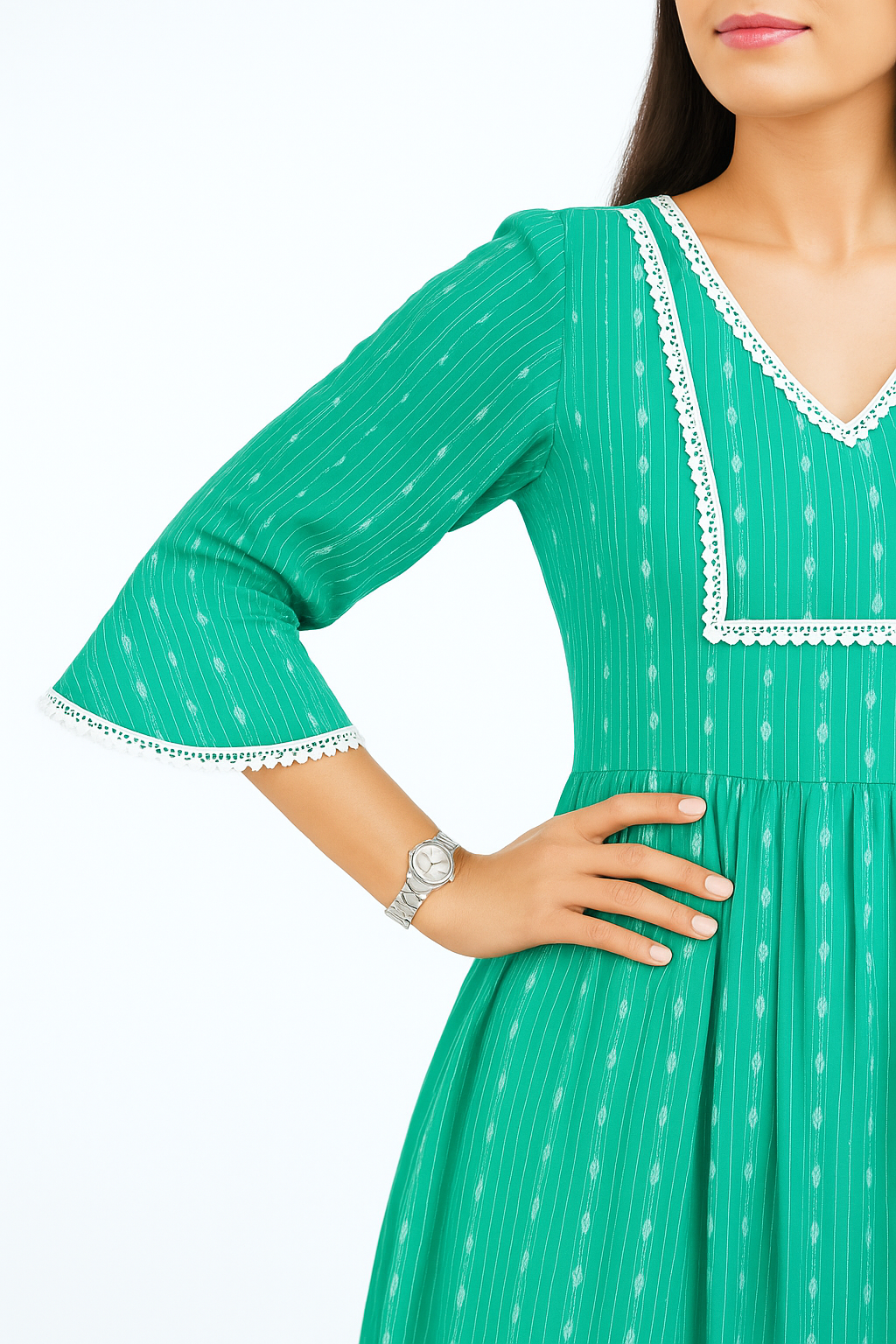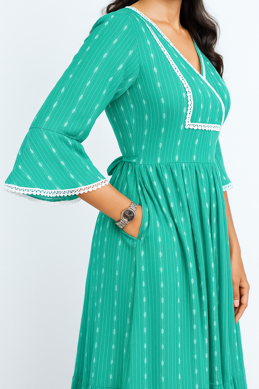 Bottle Green with White Pinstripes 100% Pure Cotton Thoughtfully crafted by Chubby Chic, this pure cotton maternity dress blends a wrap-inspired neckline with flared sleeves for easy elegance. Soft gathers at the waist make it comfortable and flattering as you grow.Thoughtfully crafted by Chubby Chic, this pure cotton maternity dress blends a wrap-inspired neckline with flared sleeves for easy elegance. Soft gathers at the waist make it comfortable and flattering as you grow.