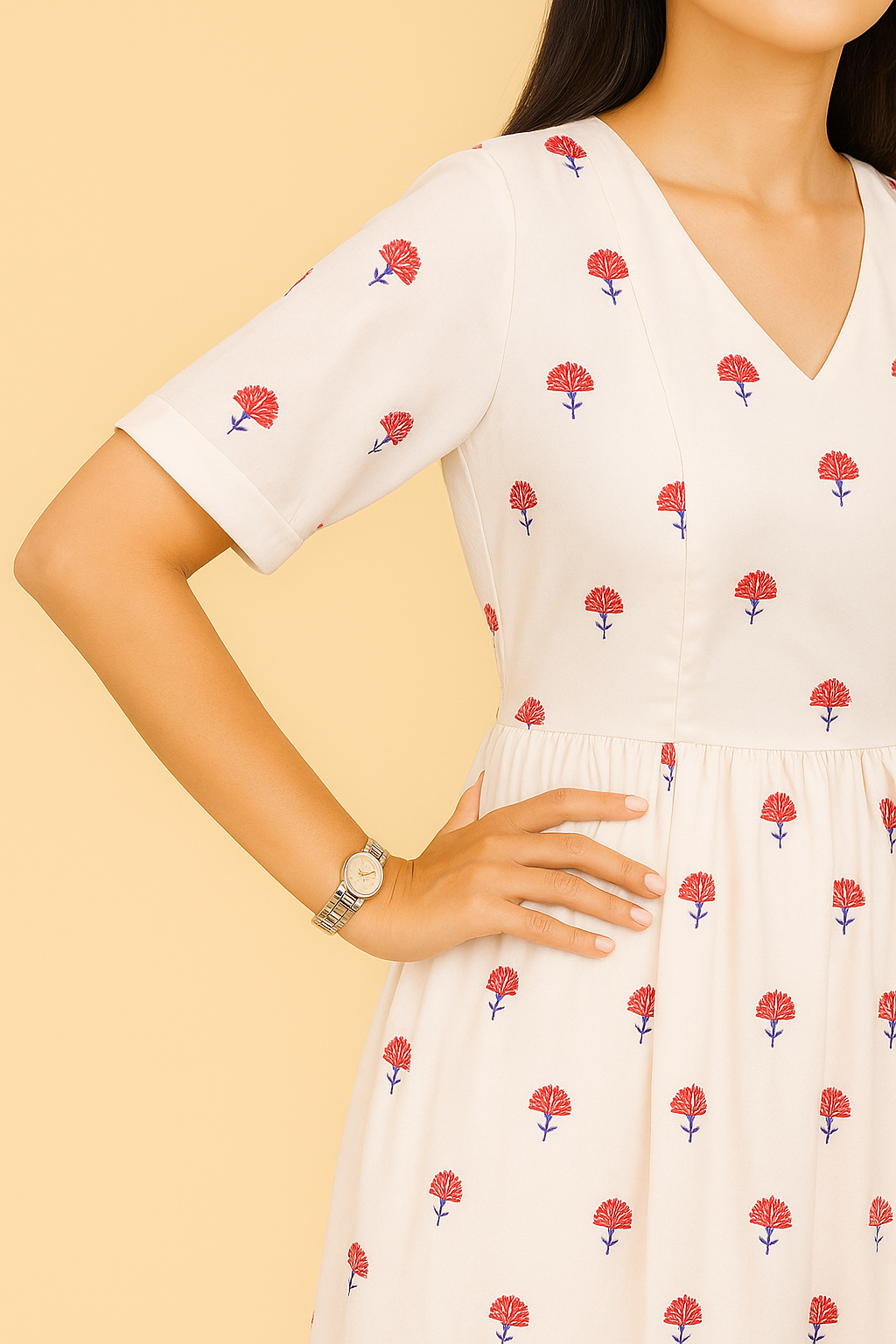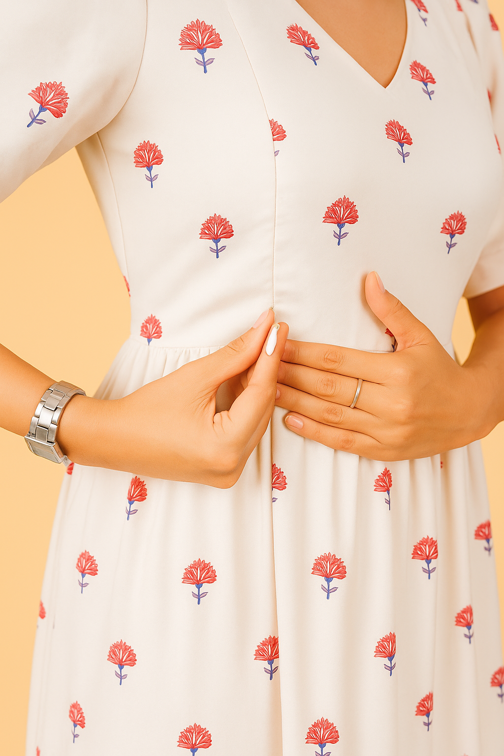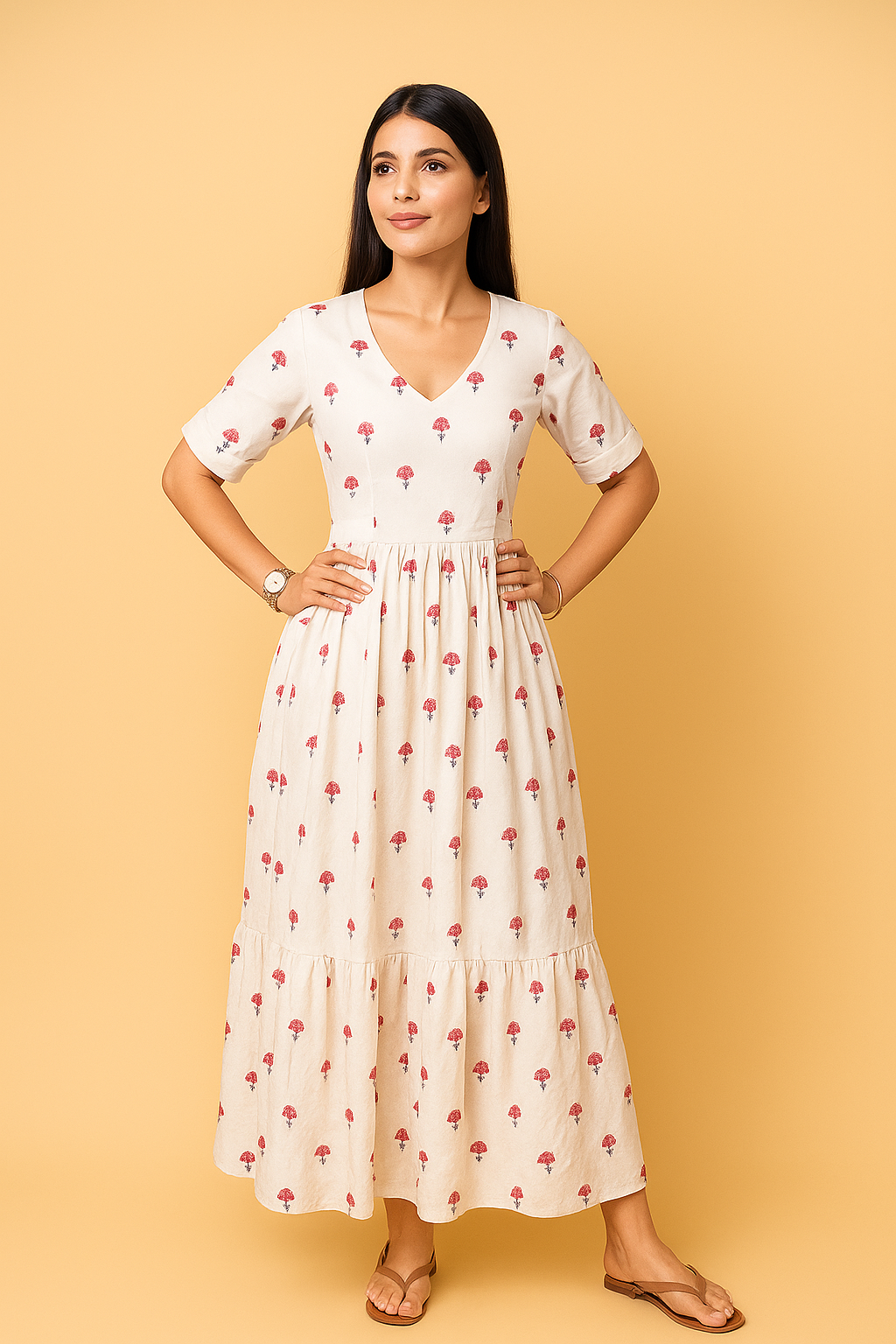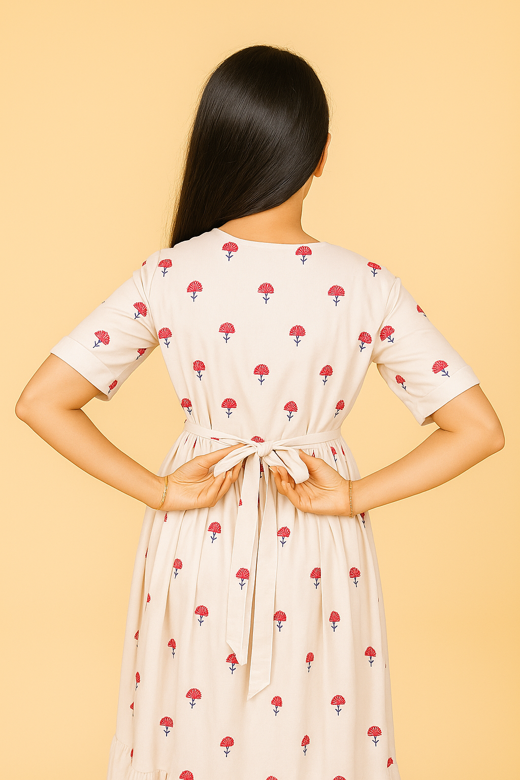 White with Red Floral Boota Print 100% Pure Cotton Crafted by Chubby Chic, this cotton dress features a soft V-neckline, elbow-length sleeves, and a tiered skirt. Red boota prints add a vibrant touch to the clean white base.Designed with hidden nursing access and an adjustable waistline, this dress blends ease and elegance ideal for pregnancy, postpartum, and everyday comfort.
