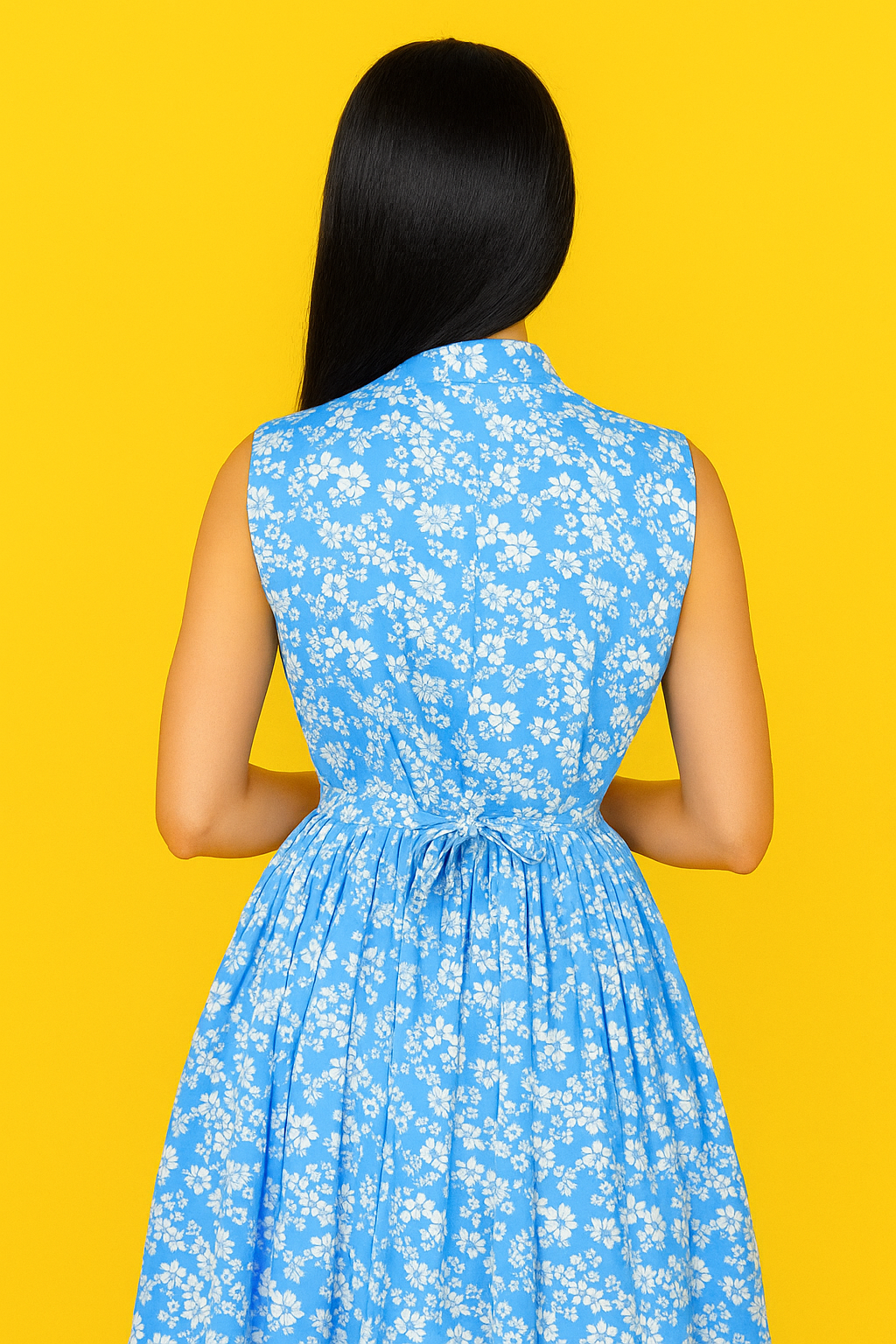 Powder Blue with White Floral Print 100% Pure Cotton Designed by Chubby Chic, this sleeveless cotton maternity dress brings everyday freshness and comfort. The gentle gathered waistline gives extra room for your growing bump, while the smart collar neckline and ruffled hem add a playful, feminine finish.Features a hidden front placket for easy nursing access and an adjustable fit for use during and after pregnancy. Perfect for sunny strolls or casual outings.